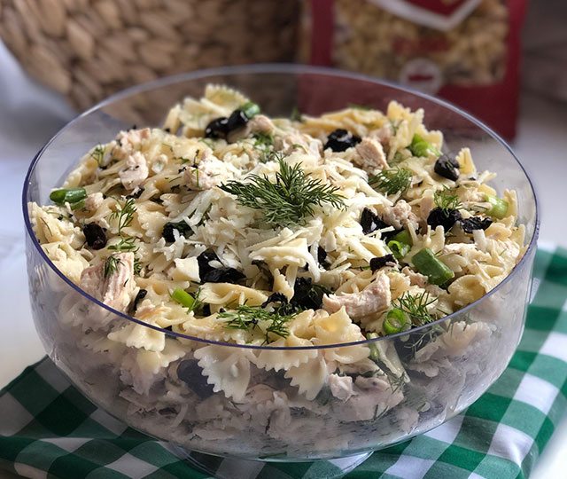 - Makarnayı bol tuzlu suda 10 dakika kadar haşlayın ve soğuması için bekletirken yarım çay bardağı zeytinyağıyla harmanlayın. Ayrı bir tencerede tavuğu haşlayın ve küp şeklinde doğrayın. Zeytinyağı, baharatlar ve limon suyunu bir kasede karıştırın. Haşlanmış makarnayı soğuyunca, doğranmış biber, zeytin, taze soğan, tavuk, dereotu ve sosla birleştirerek harmanlayın. Tulum peyniri serperek servis yapın.Afiyet olsun...